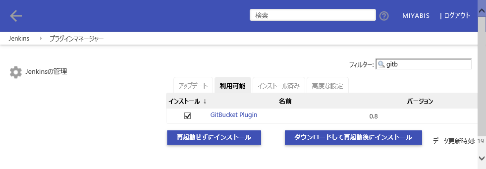 「Jenkinsの管理」メニューで「プラグインの管理」-「利用可能」を選択してフィルターに ”gitb” と入力し表示されたプラグインをチェックしたら「ダウンロードして再起動後にインストール」をクリックします。