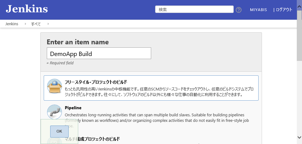 「新規ジョブ作成」でジョブを作成します。通常は「フリースタイル・プロジェクトのビルド」で作成します。