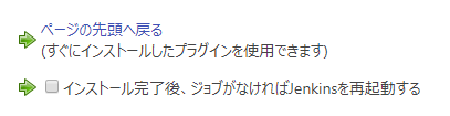 「プラグインのインストール/アップグレード」ページで「インストール完了後、ジョブがなければJenkinsを再起動する」にチェックを入れて再起動します。