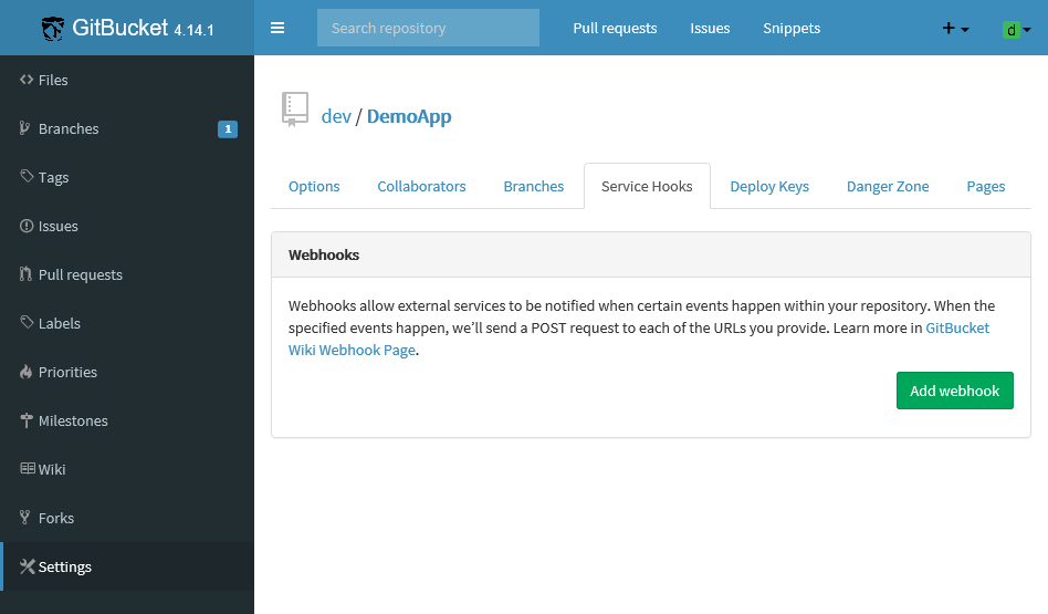 GitBucket のプロジェクトサイトで「Settings」の「Service Hooks」をクリックします。
