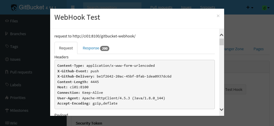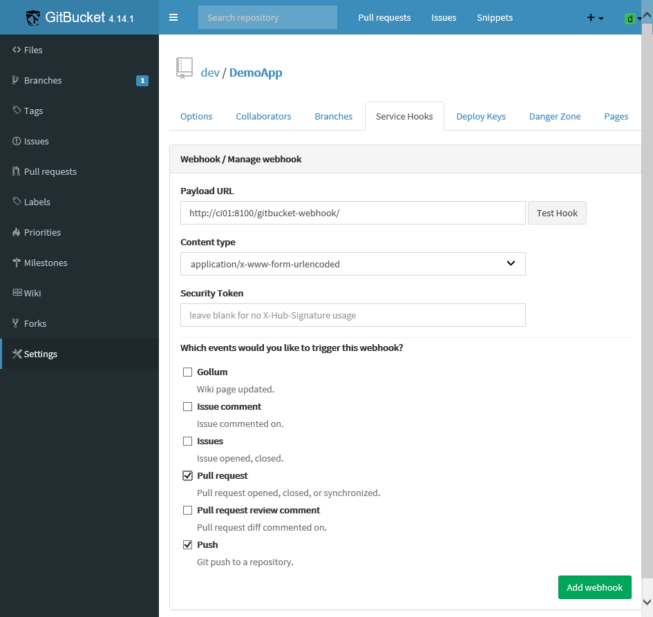 「Add webhook」 をクリックし「Payload URL」、「Content type」、「Security Token」を入力し「Test Hook」をクリックします。「Payload URL」は Jenkinsのトップページに「gitbucket-webhook/」を付けます。「Security Token」はソース取得だけなら未入力にしておきます。