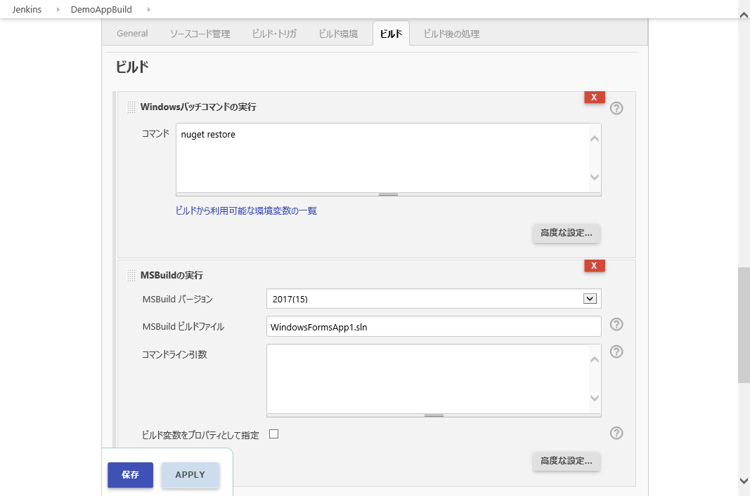 「MSBuildの実行」を追加してビルドするソリューションを指定します。NuGet パッケージを追加しているときは最初に「Windowsバッチコマンドの実行」を追加して NuGet のリストア「nuget restore」を実行します。