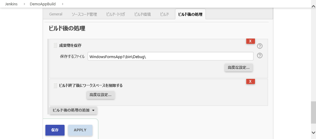 成果物(ビルド出力ファイル)の保存と容量削減のためワークスペースのクリアをしておきます。