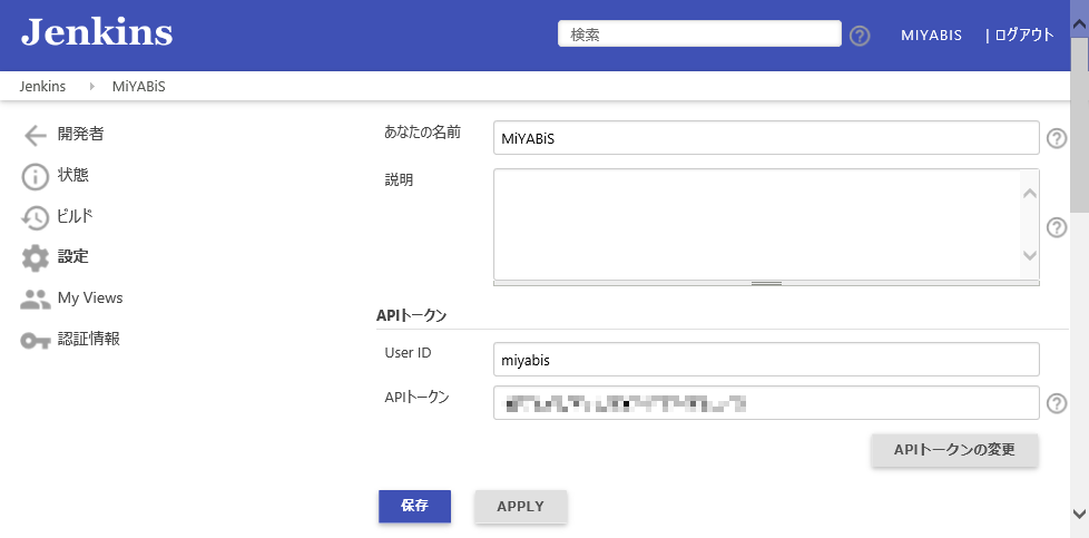 Jenkins のヘッダーにあるユーザー名をクリックし「設定」メニューで APIトークンを控えておきます。