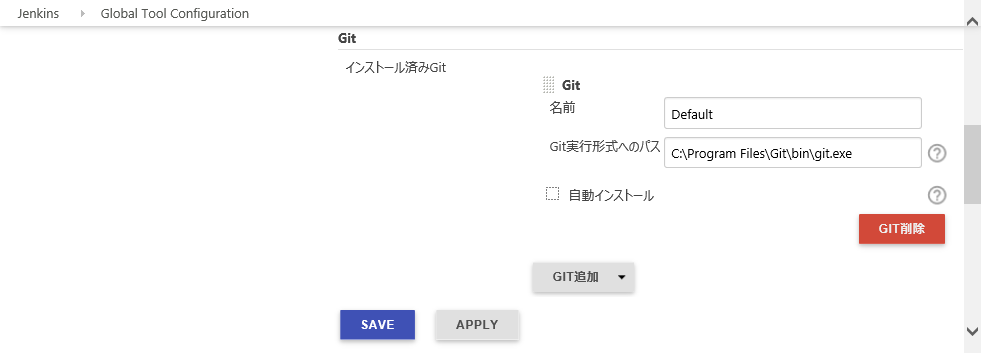 「Jenkinsの管理」メニューの「Global Tool Configuration」で Git のパスを設定します。